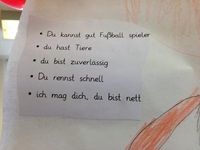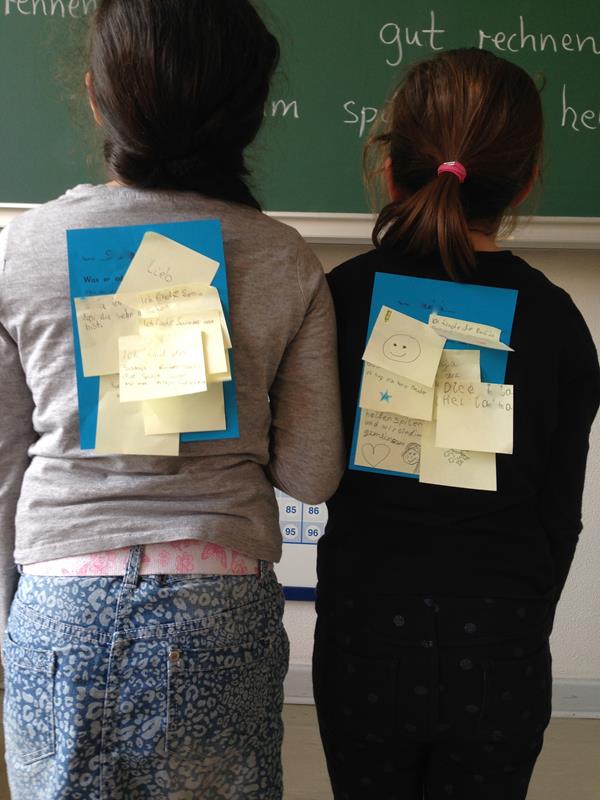 Für jedes Kind sammelten wir erfreuliche Verhaltensweisen, indem wir uns mit beschriebenen Klebezetteln ‚den Rücken stärkten’ und so für jede Eule typische Stärken sammelten:
